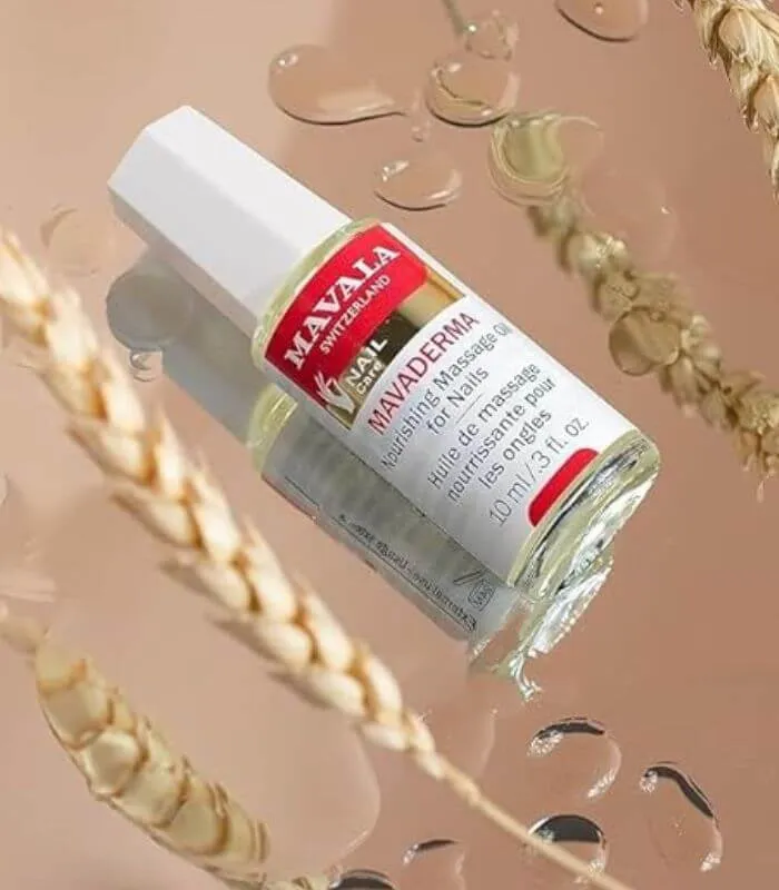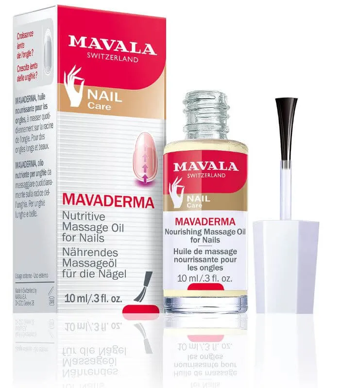 Mavala Mavaderma is a nourishing massage oil formulated to stimulate nail growth by improving blood circulation. Contains wheat germ, olive, and sweet almond oils.